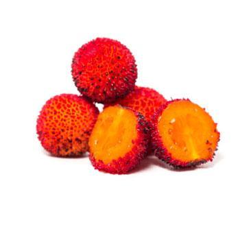 - Red and yellow strawberry-like but kiwi-flavored fruit appears in fall and winter.